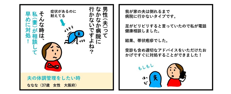 我が家の夫は倒れるまで病院に行かないタイプです。足がピリピリすると言っていたので私が電話健康相談しました。結果、帯状疱疹でした。受診も含め適切なアドバイスをいただけたおかげですぐに対処することができました!
