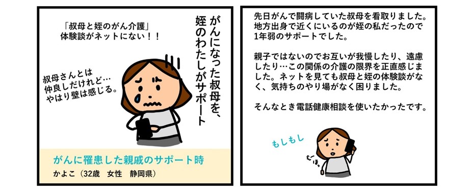 先日がんで闘病していた叔母を看取りました。地方出身で近くにいるのが姪の私だったので1年弱のサポートでした。親子ではないのでお互いが我慢したり、遠慮したり…この関係の介護の限界を正直感じました。ネットにたくさんある体験談には叔母×姪はなく、気持ちのやり場がなく困りました。そんなとき電話健康相談を使いたかったです。