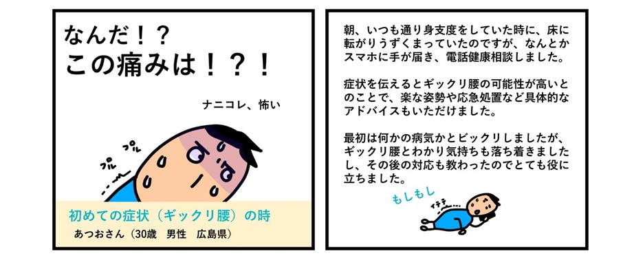 いつ、どんな健康トラブルが起こるかわかりません。あつおさんのように初めてのぎっくり腰などのときも、電話健康相談は有効だと思います。電話健康相談では「診断」はできませんが、どのような病気やケガの可能性があるか、対処の正しい方法をお伝えすることができるので、突然の健康トラブルにも利用していただけます。スマホにあらかじめ電話番号登録やブックマークをしていると安心ですね。